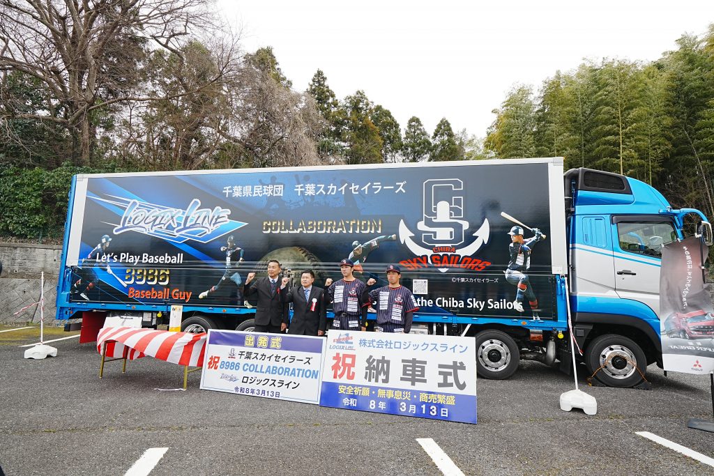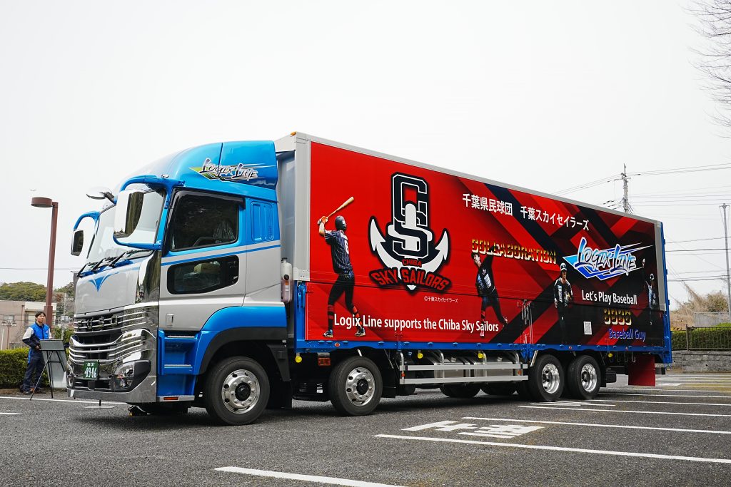 弊社トラックの大半は全面プリントを施した車両が多いので私より次回の新車(大型車)に千葉スカイセラーズをペイントして走りましょうかと提案させて頂きました。両者が一致しましたので球団ロゴや選手の写真を資料として頂き京都城陽市でトラックペイントを施すリアライズ松田社長に試行錯誤して頂き目を見張る千葉スカイセイラーズとロジックスラインとのコラボレーショントラックが完成しました。*(私が成田→京都→成田を一人で回送しました)