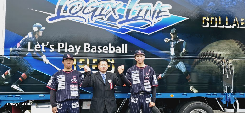 弊社トラックの大半は全面プリントを施した車両が多いので私より次回の新車(大型車)に千葉スカイセラーズをペイントして走りましょうかと提案させて頂きました。両者が一致しましたので球団ロゴや選手の写真を資料として頂き京都城陽市でトラックペイントを施すリアライズ松田社長に試行錯誤して頂き目を見張る千葉スカイセイラーズとロジックスラインとのコラボレーショントラックが完成しました。*(私が成田→京都→成田を一人で回送しました)